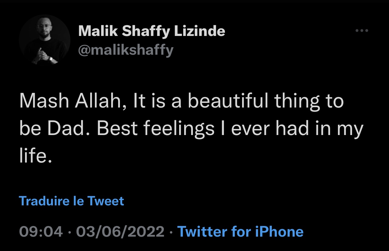 Abinyujije ku rukuta rwe rwa Twitter, Malik Shaffy yagaragaje ibyishimo yatewe no kuba kuri ubu agiye kuzajya yitwa Papa w’umwana. Malik Shaffy yagize ati « Mash Allah, It is a beautiful thing to be Dad. Best feelings I ever had in my life ».
