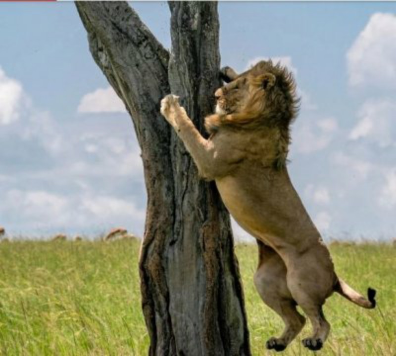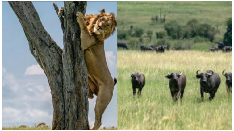 Intare umwami w’ishyamba yagize ubwo yitabaza igiti ,ubwo yagwaga mu ishyo ry’imbogo ,maze igira ubwoba ibura aho ikwirwa.