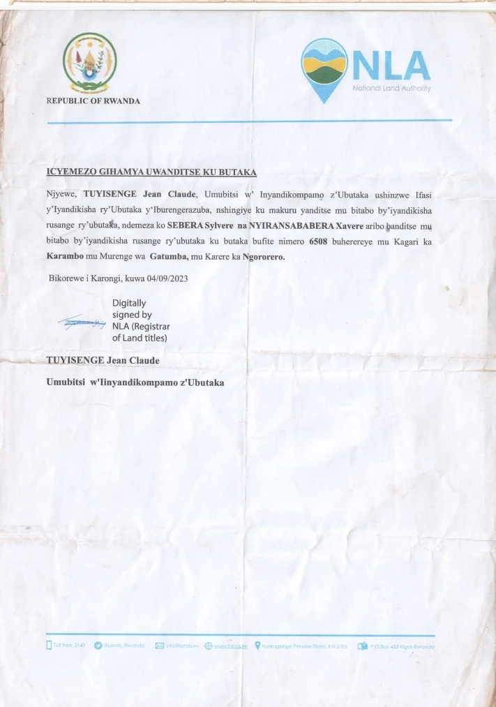 Nkusi avuga ko kugira ngo hafatwe undi mwanzuro kuri ubwo butaka, ari ngombwa kwitabaza umubitsi w’impapuro mpamo z’ubutaka mu ifasi y’Intara y’Iburengerazuba, hagasobanuka ukuntu ubutaka bwa Nyiransababera bwageze ku muhungu we.Ntawamenya niba umubitsi w’impapuro mpamo z’ubutaka mu Ifasi y’Iburengerazuba, azivuguruza ku nyandiko ubwe yahaye Nyiransababera, igaragaza ko ubutaka bufite nomero 6508 ari ubwa Sebera Sylvere na Nyiransababera Xavera n’ubwo bitabujije ko Banki y’Abaturage ishami rya Nyabihu ibuteza cyamunara, mu mazina ya Harerimana Medard, umuhungu wa Nyiransababera.