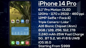 iPhone 14 Pro – 6.1″ Pro Motion OLED – 120Hz Display with a 1170 x 2532 resolution