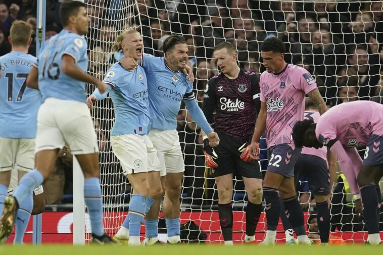 Manchester City's Erling Haaland, centre, celebrates after scoring the opening goal during the English Premier League soccer match between Manchester City and Everton at the Etihad Stadium in Manchester, England, Saturday, Dec. 31, 2022. (AP Photo/Dave Thompson)