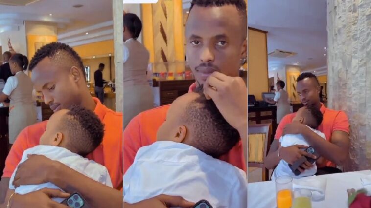 Myugariro w’ikipe y’igihugu Amavubi, Usengimana Faustin yahaye isomo abandi bagabo nyuma yo kugaragara ari kwita ku mwana we kugira ngo asinzire.