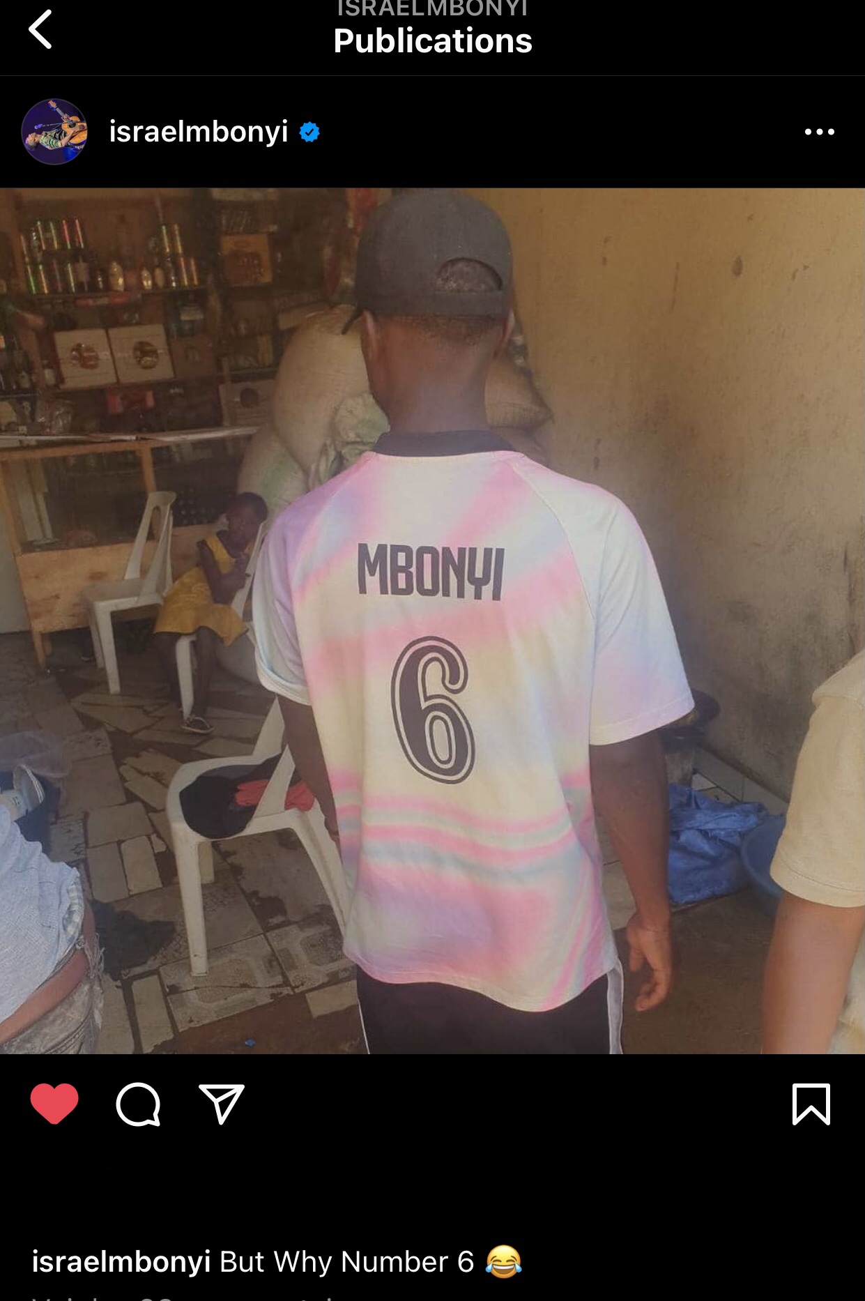 Israel Mbonyi abinyujije ku rukuta rwe rwa instagram yagaragaje ko yasekejwe n’umwe mu bafana be wari wambaye umupira wanditseho izina rye (MBONYI) gusa riherekejwe n’umubare wa 6.