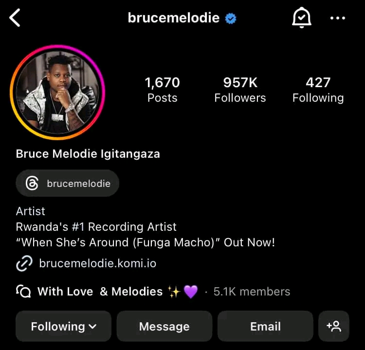 Kugeza ubu tariki 29 Ugushyingo 2023 imibare ya Instagram igaragaza ko Bruce Melodie akurikirwa n’abasaga ibihumbi 957 mu gihe Meddy wari ku mwanya wa mbere akurikirwa n’ibihumbi 955.