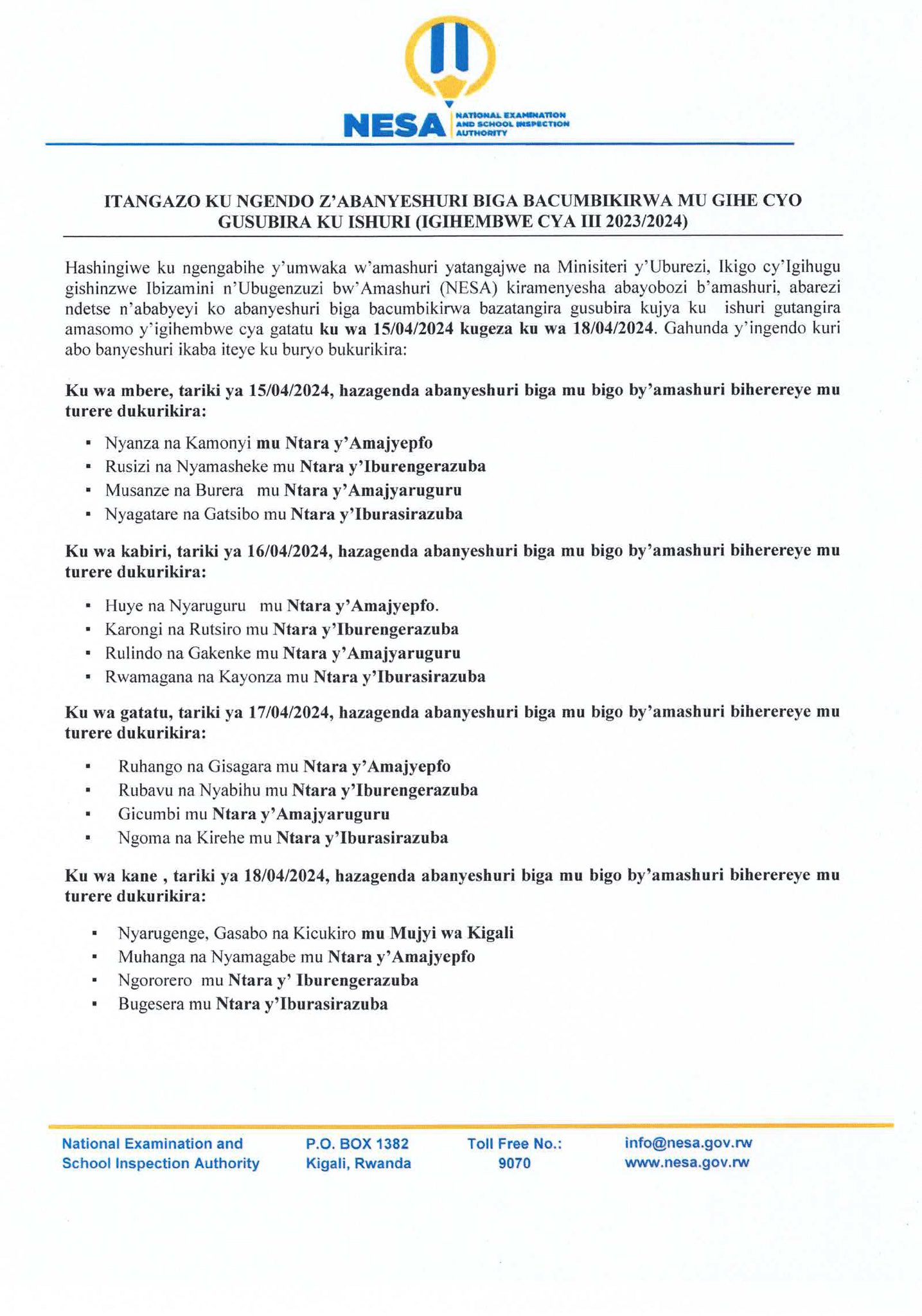 Ikigo cy’Igihugu gishinzwe Ibizamini n’Ubugenzuzi bw’Amashuri NESA cyatangaje ingengabihe y’uburyo abanyeshuri biga bacumbikiwe ku bigo by’amashuri, bazasubirayo mu gihembwe cya gatatu.