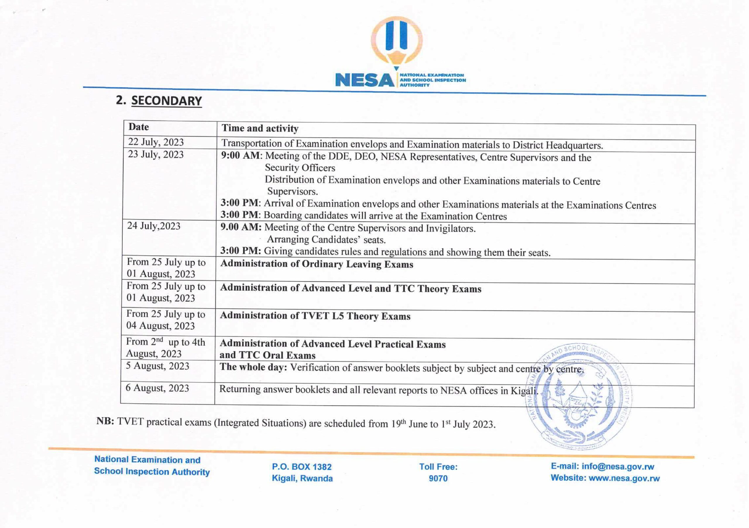 Nesa yerekanye ko ibizamini bizatangira ku wa 25 Nyakanga bigasozwa ku wa 1 Kanama ku banyeshuri bo mu kiciro rusange no mu mashuri yisumbuye.