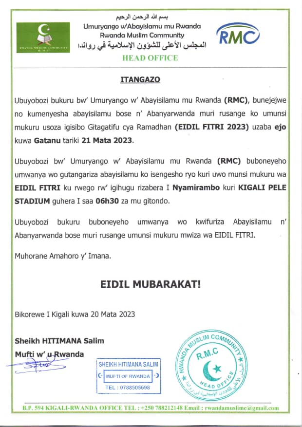 Nyuma yo kumara iminsi mu gisibo cya Ramdhan, ubuyobozi bw’umuryango w’abayisilamu mu Rwanda, RMC bwavuze ko umunsi wo gusoza igisibo ari ku munsi w’ejo tariki ya 21 Mata 2023.
