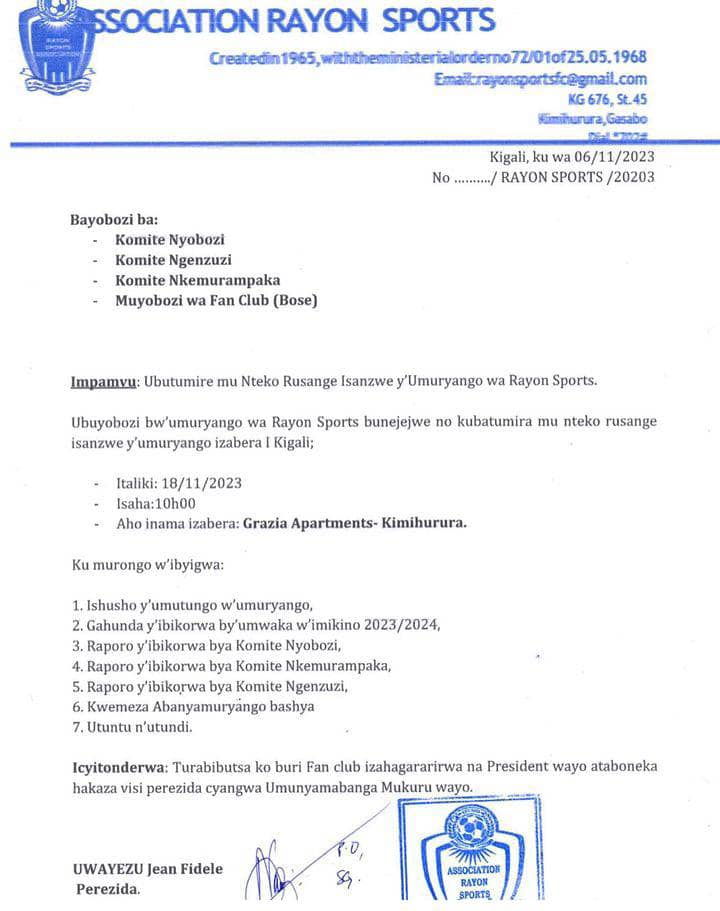 Ibi bikubiye mu itangazo ry’ubutumire Rayon Sports yahaye abanyamuryango bayo.