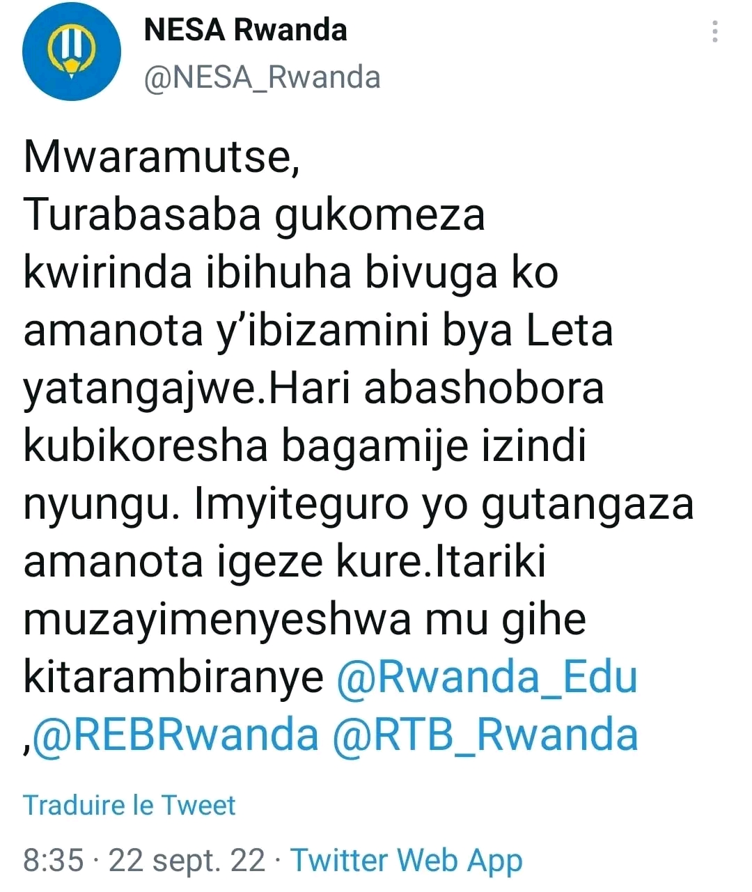Ikigo k’igihugu gishinzwe ubugenzuzi bw’amashuri n’ibizamini mu Rwanda NESA, iramenyesha ababyeyi ko amanota y’ibizamini bya Leta atari yasohoka.