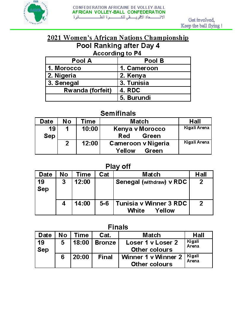 Ishyirahamwe ry’umukino wa Volleyball muri Afurika (CAVB) ryatangaje ko kuri iki Cyumweru tariki 19 Nzeri 2021 aribwo hari buze kuba imikino ya nyuma (semi-finals and finals) mu irushanwa rya African Women Volleyball championship 2021 ririmo kubera mu Rwanda. Nkuko bigaragara ku rutonde rwashyizwe hanze na CAVB ikipe y’U Rwanda Amavubi ntabwo iri mu makipe ari buze gukina iyi mikino isoza iri rushanwa rya African Women Volleyball championship 2021.