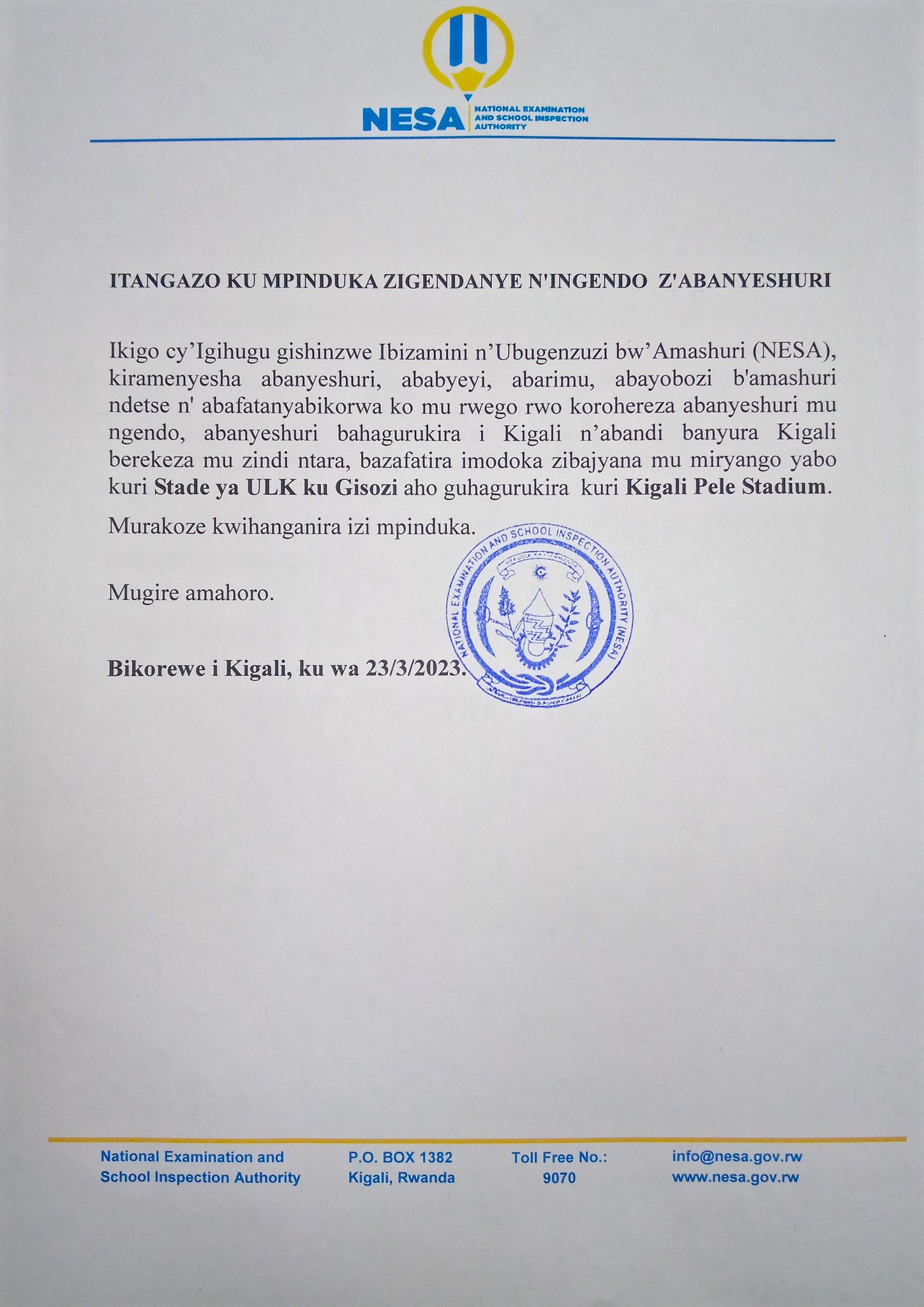 Ikigo cy’igihugu gishinzwe Ibizamini n’Ubugenzuzi bw’Amashuri(NESA) cyatangaje ko habayeho impinduka mu ngendo z’abanyeshuri bava mu bigo byabo bagaca i Kigali.
