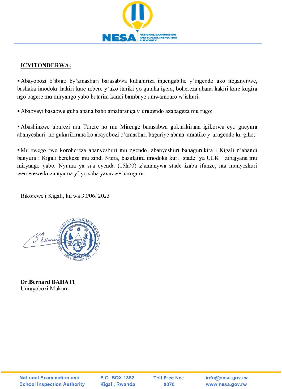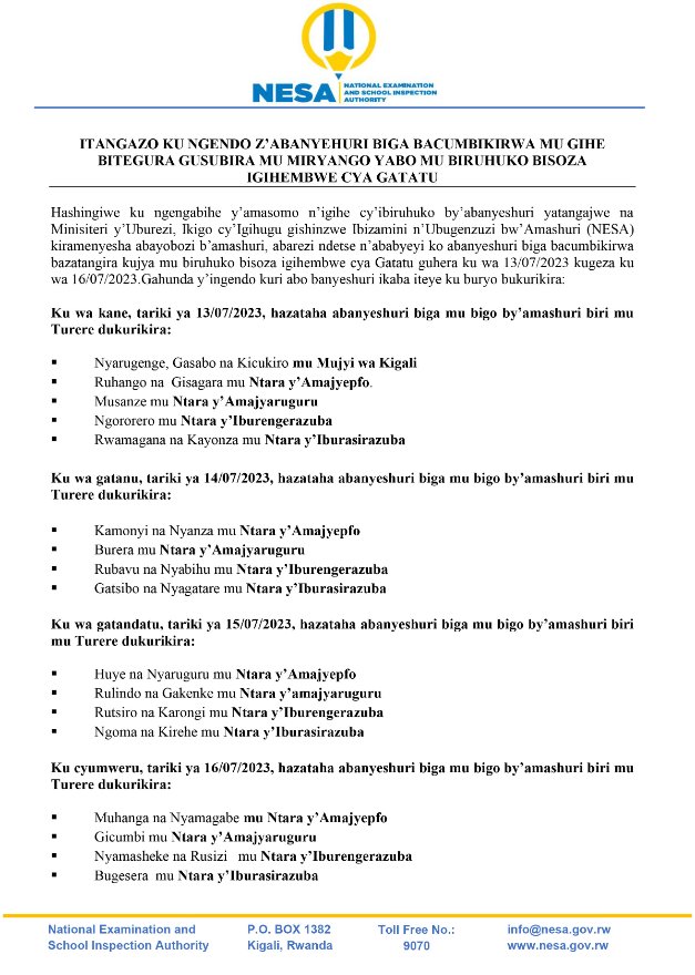 Itangazo ku ngendo z’abanyeshuri biga bacumbikirwa mu gihe bitegura gusubira mu miryango yabo mu biruhuko bisoza igihembwe cya 3.