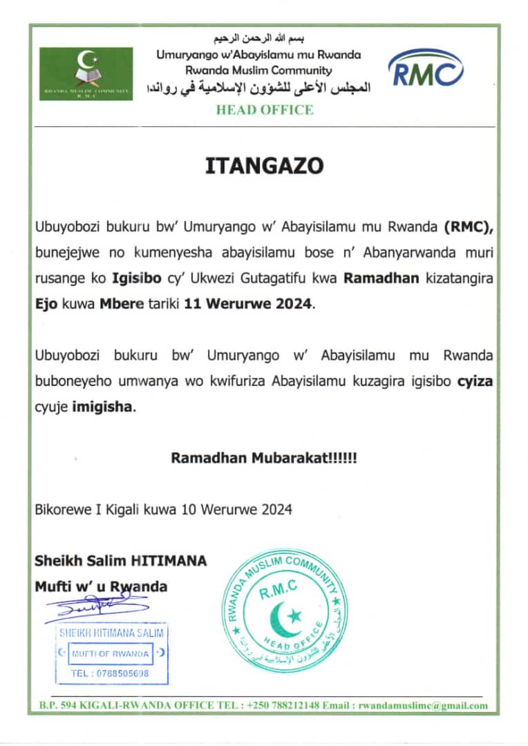 Umuryango w’Abayisilamu mu Rwanda(RMC), watangaje igihe igisibo cy’ukwezi gutagatifu, Ramadhani kizatangirira.