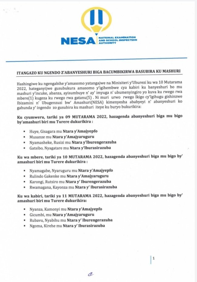 Ubuyobozi bw’Ikigo cy’igihugu gishinzwe ibizamini n’ubugenzuzi bw’amashuri (NESA) bubinyujije ku rukuta rwabo rwa Twitter rwashyize ahagaragara itangazo rireba abanyeshuri bose biga bacumbikirwa ku bigo byabo bari mu biruhuko muri iki gihe.