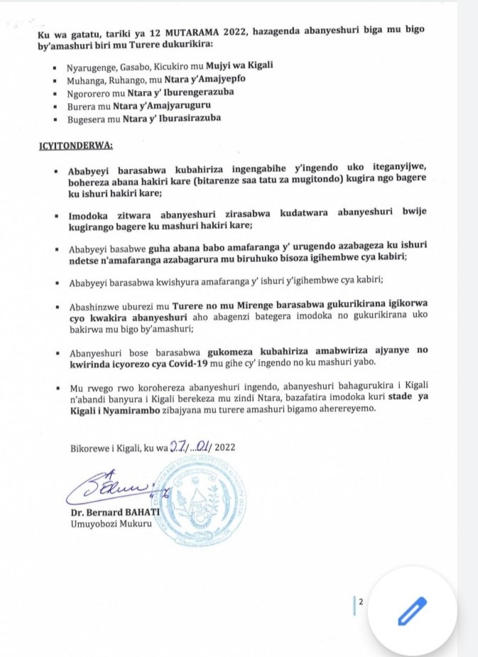 Iri tangazo rijyanye n’ingendo zabo basubira ku ishuri ni iri rikurikira: