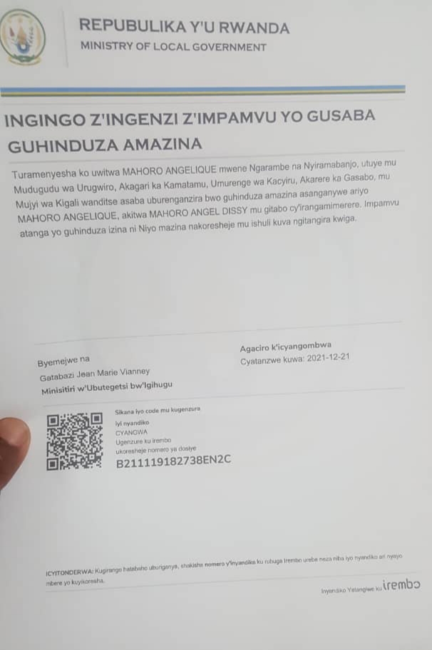 Itangazo ryo guhindura izina akitwa Mahoro Angel Dissy