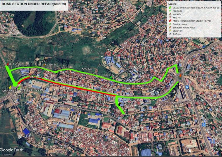 Umujyi wa Kigali uramenyesha abantu bose ko guhera tariki ya 28/10/2023 kugera tariki ya 04/11/2023 igisate cy’umuhanda wa Rwandex -Sonatube (KN 3 Rd) kizaba gifunze kubera imirimo yo kuwusana.
