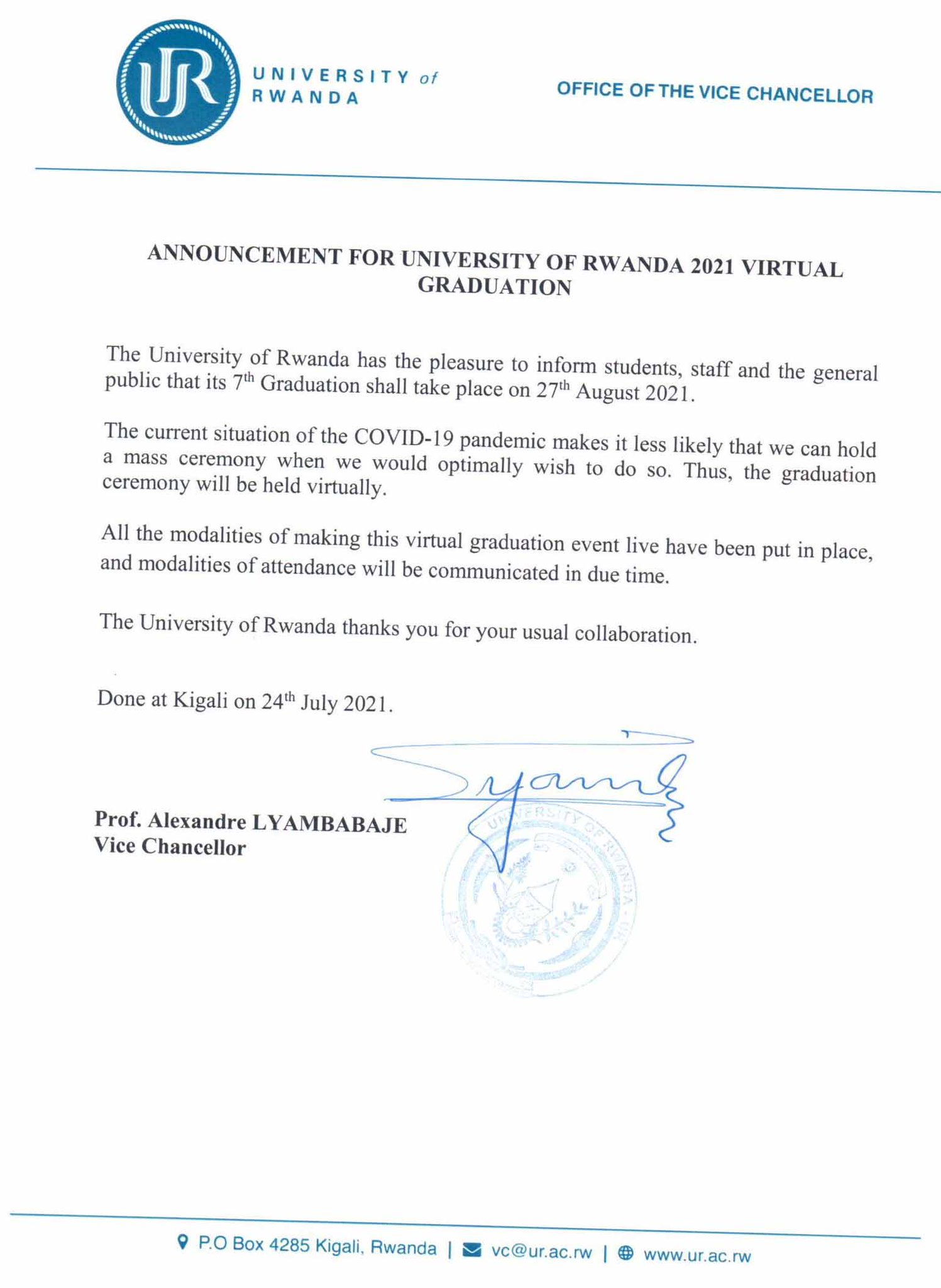 Nkuko bigaragara muri iri tangazo ryashyizweho umukono na Vice Chancellor wa UR, Prof. Alexandre LYAMBABAJE, itariki ya Graduation ku banyeshuri basoje amasomo yabo ni Ku ya 27 Kanama 2021.