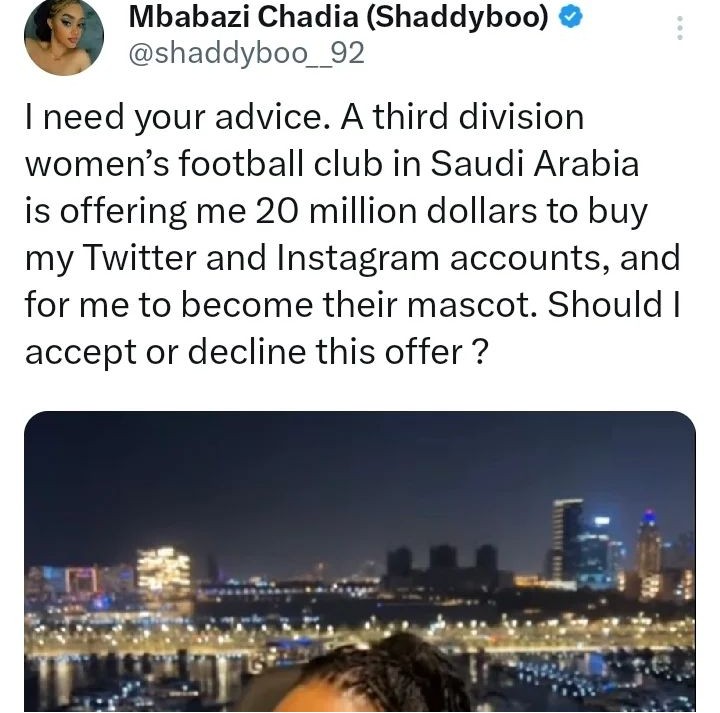Shaddyboo abinyujije ku rubuga rwe rwa Twitter, yasabye inama abamukurikira [Followers] kugira ngo amenye icyemezo afata bitewe n’uko ikipe y’umupira w’amaguru y’abagore yo mu Cyiciro cya Gatatu muri Arabie Saoudite yamusabye kugura imbuga nkoranyambaga ze ngo imuhe akayabo ka miliyoni 20$ [miliyari na miliyoni 613.900 22 Frw].