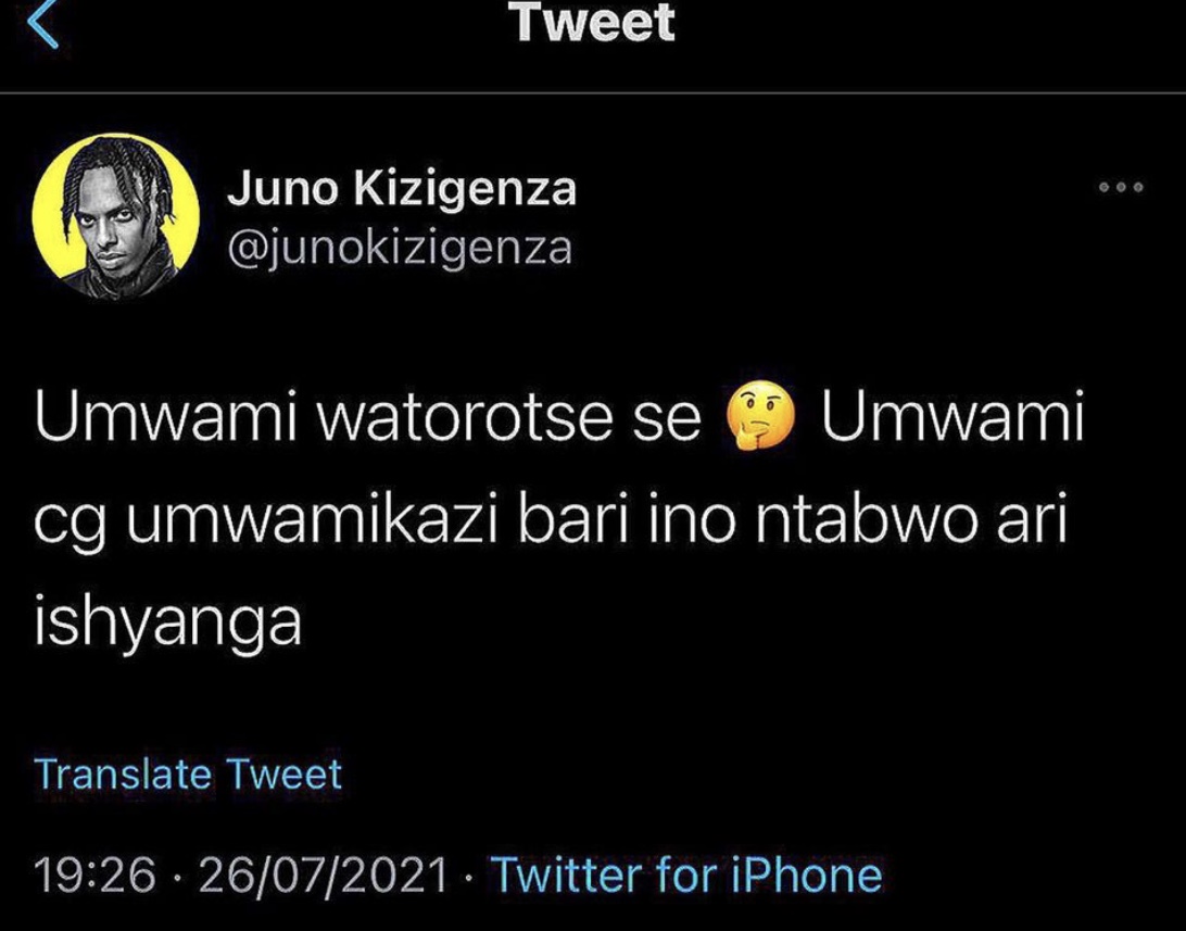 Ku mugoroba wo ku munsi w’ejo umuhanzi Juno Kizigenza abinyujije ku rukuta rwe rwa Twitter yatangaje ko we na Ariel Wayz ari umwami n’umwamikazi ndetse ahita yerura anavugako nta mwami uta ingoma ngo ajye ishyanga.