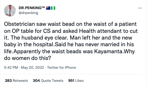 Umugabo yataye umugore we utwite mu bitaro nyuma yo gukoresha inzaratsi ashaka ko amukundwakaza.Dr Penking yerekeje kuri Twitter kugira ngo atangaze ibintu bitangaje ku mugabo wahunze umugore we utwite.