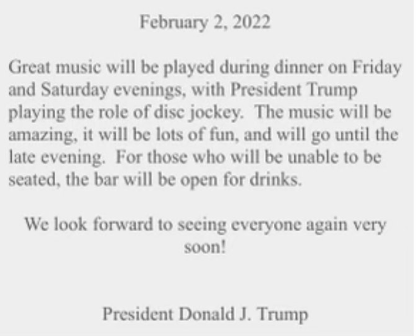 Abagize iyi Club ya Donald Trump guhera 1985, babonye ubutumwa icyumweru gishize buvuga ko bazafatwa neza bumva umuziki mwiza mu gihe bazaba basangira ibya n’injoro, ibi burori bikazaba tariki 12 Gashyantare 2022.