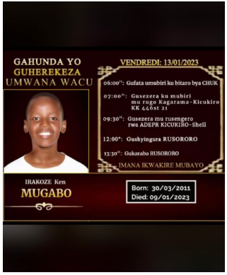 Uwitabye Imana ni Kenny Mugabo wigaga mu mwaka wa 5 w’amashuri abanza , kugeza kuri ubu amakuru ahari avuga ko uyu mwana azashyingurwa mu cyubahiro kuwa gatanu tariki 13 Mutarama 2023 .