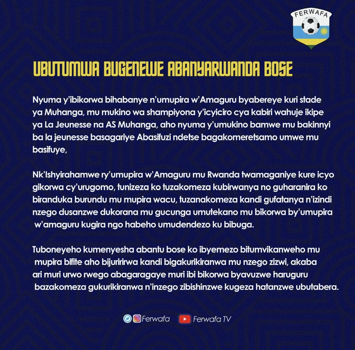 Mu itangazo rigenewe abanyamakuru Ferwafa yashyize hanze, yamaganiye kure ibikorwa bya kinyamaswa byakozwe n’abakinnyi ba La Jeaunesse.