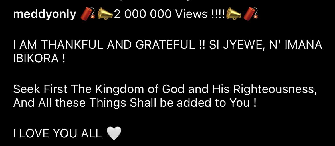 Ubwo iyi ndirimbo yuzuzaga umubare w’abantu basaga miliyoni 2 bamaze kuyireba, Meddy yashimiye abantu bose barebye iyi ndirimbo maze yongeraho amagambo agira ati « Si njyewe ni Imana ibikora » asubiza abantu bose bagiye bavuga ko views ariwe uzigura.