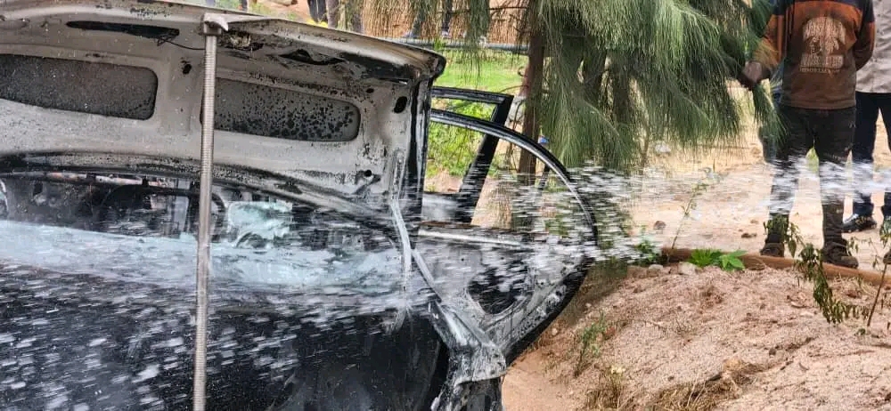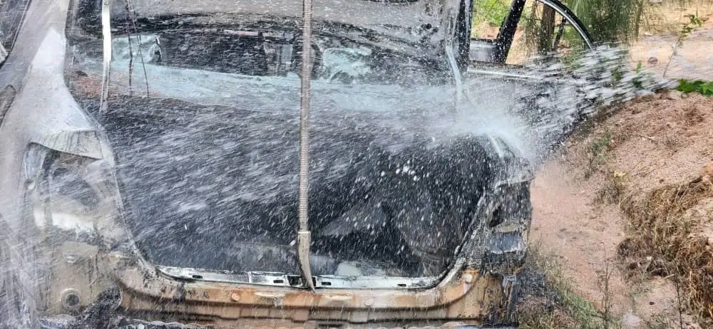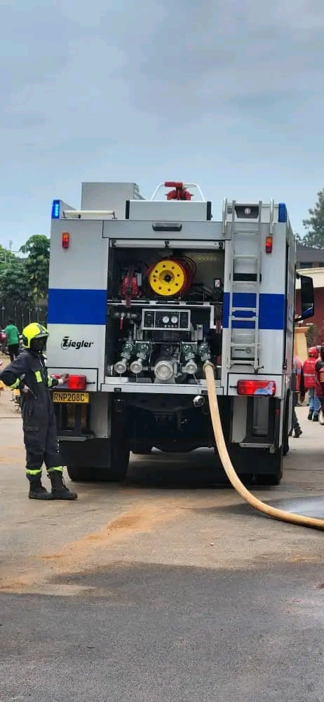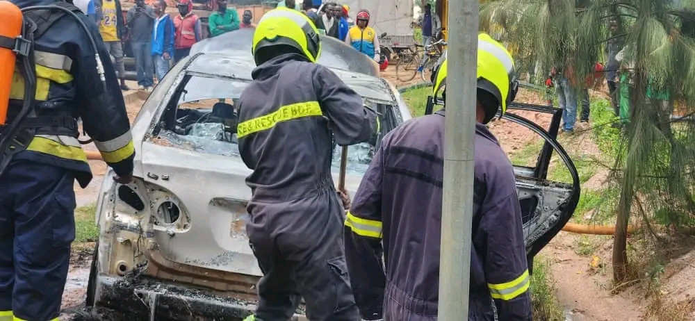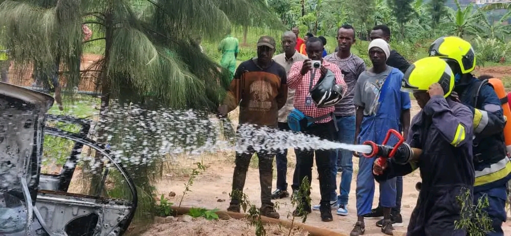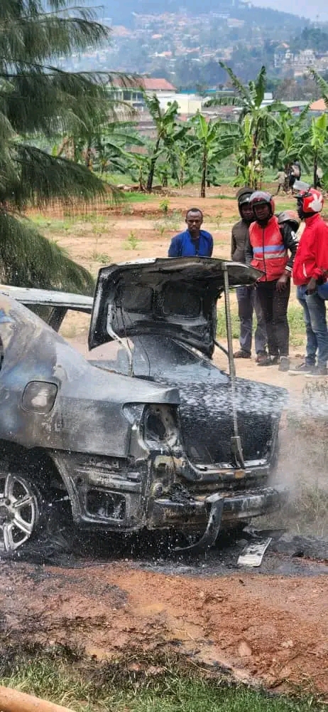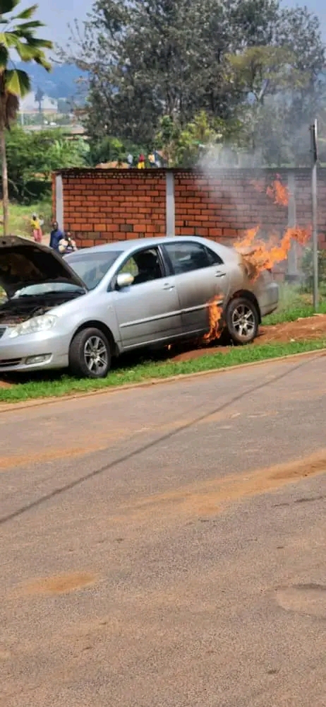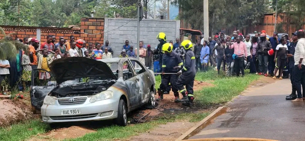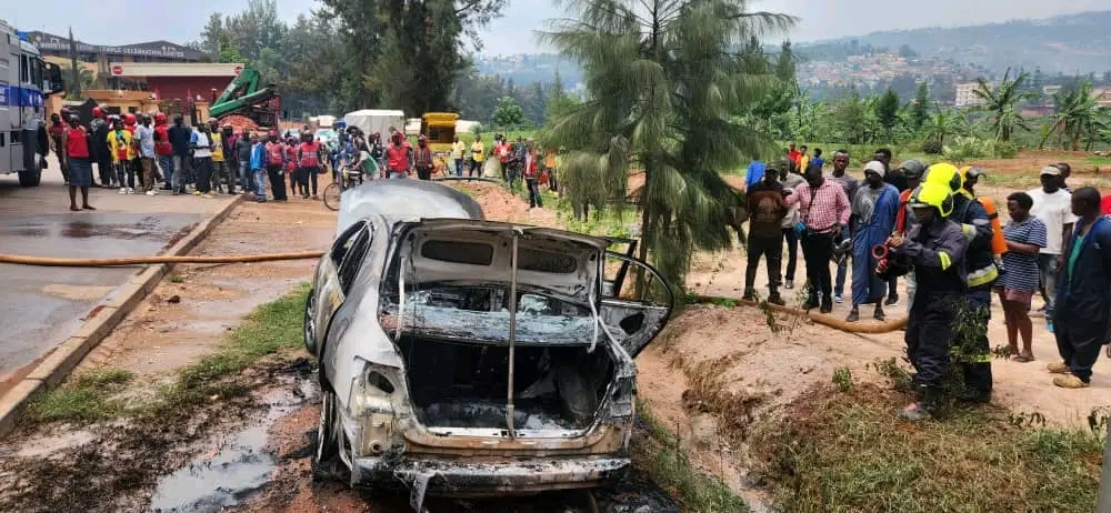 Ishami rya Polisi y’u Rwanda rishinzwe kurwanya inkongi no kuzizimya, ryagerageje kuzimya iyi modoka iri mu bwoko bwa Toyota ariko birangira ihiye irakongoka.