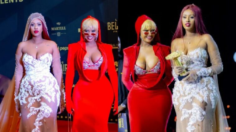 Abakobwa bagize itsinda rya Kigali Boss Babies uko bari babiri; Queen Douce ndetse na Alliah Cool, ubwo bari bahamagawe ngo batange igihembo cy’umuhanzi mwiza w’umugabo cyatwawe na Davido, basa nk’aho babanje gucangwa n’imbaga y’abantu bari bahagaze imbere.