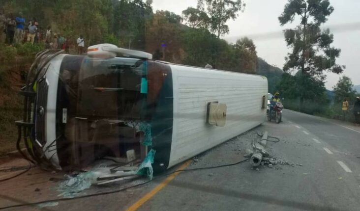 Imodoka itwara abagenzi rusange yavaga i Rubavu yerecyeza mu i Kigali, yakoreye impanuka mu Murenge wa Kanyinya mu Karere ka Nyarugenge, igonga ipoto na yo igwa mu muhanda, ku bw’amahirwe ntihagira uhasiga ubuzima.