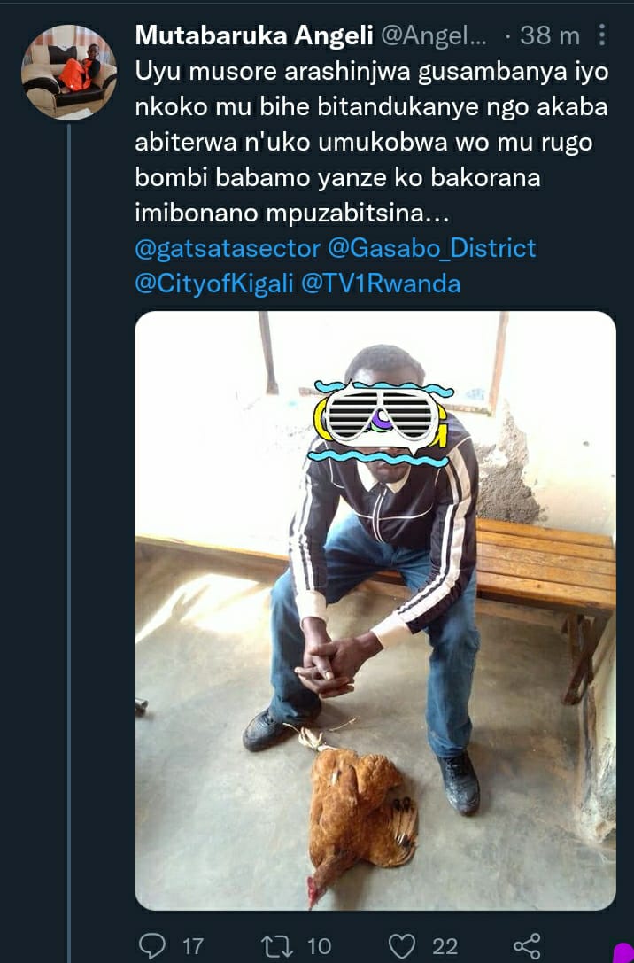 Amakuru y’umutekano avuga ko uyu musore “bivugwa ko amaze imisi “asambanya inkoko” y’umuturanyi we. Ngo impamvu ibimutera ni uko hari umukobwa “yaterese ariko yanga ko baryamana.”