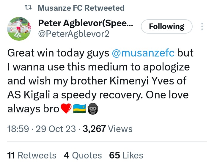 Abinyujije ku rukuta rwe rwa X, Peter Agblevor yagize ati “Intsinzi ikomeye uyumunsi basore ba Musanze FC, ariko ndashaka gukoresha ubu buryo kugirango nsabe imbabazi kandi nifurije murumuna wanjye Kimenyi Yves wa AS Kigali gukira vuba.”