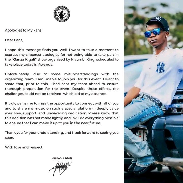 Umuhanzi w’umurundi Kirikou Akili yashyize ahagaragara itangazo asaba imbabazi abafana be nyuma yo kudashyikira igitaramo cya “Ganza Kigali”, cyari cyateguwe na Kivumbi King mu Rwanda.