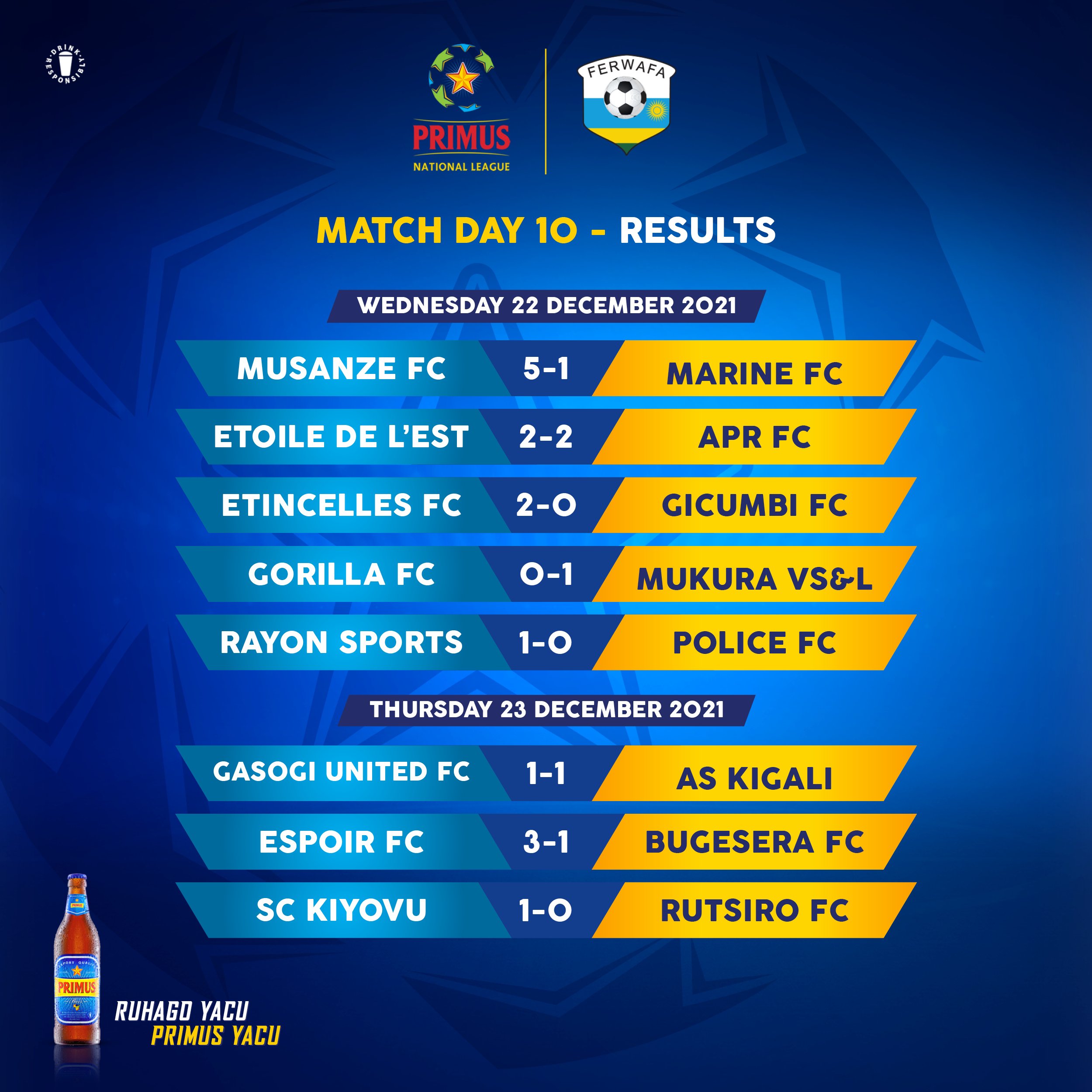 Umunsi wa 10 wa shampiyona y’ikiciro cya mbere mu Rwanda usize Rayon Sport ku mwanya wa kabiri, mu gihe Kiyovu Sport ikomeje kwanikira amakipe ayikurikiye.