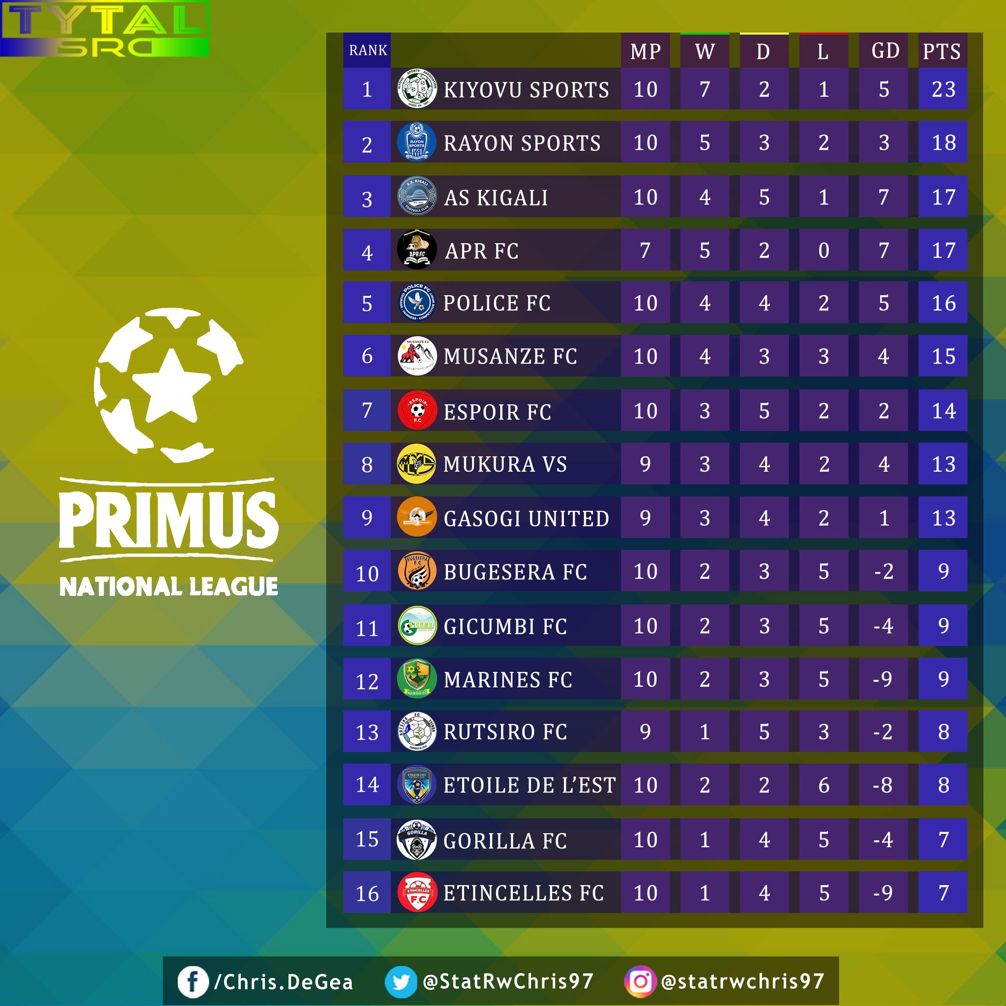 Uyu munsi usize Kiyovu Sport ku mwanya wa mbere n’amanota 23 irusha Rayon Sport iyikurikiye amanota atanu, mu gihe APR FC na AS Kigali zikurikiyeho ku mwanya wa gatatu n’uwa kane zinganya amanota, 17, zombi, ariko APR FC ifite imikino itatu y’ibirarane.