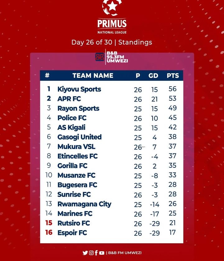 Dore uko urutonde ruhagaze  nyuma y’umunsi wa 26 wa shampiyona.