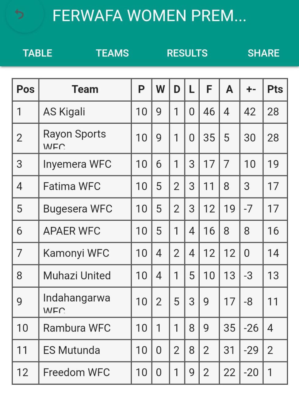 Rayon Sports WFC na AS Kigali WFC zombi zinganya amanota 28 ku rutonde rwa Shampiyona, aho izikurikiye zizirusha amanota 9.