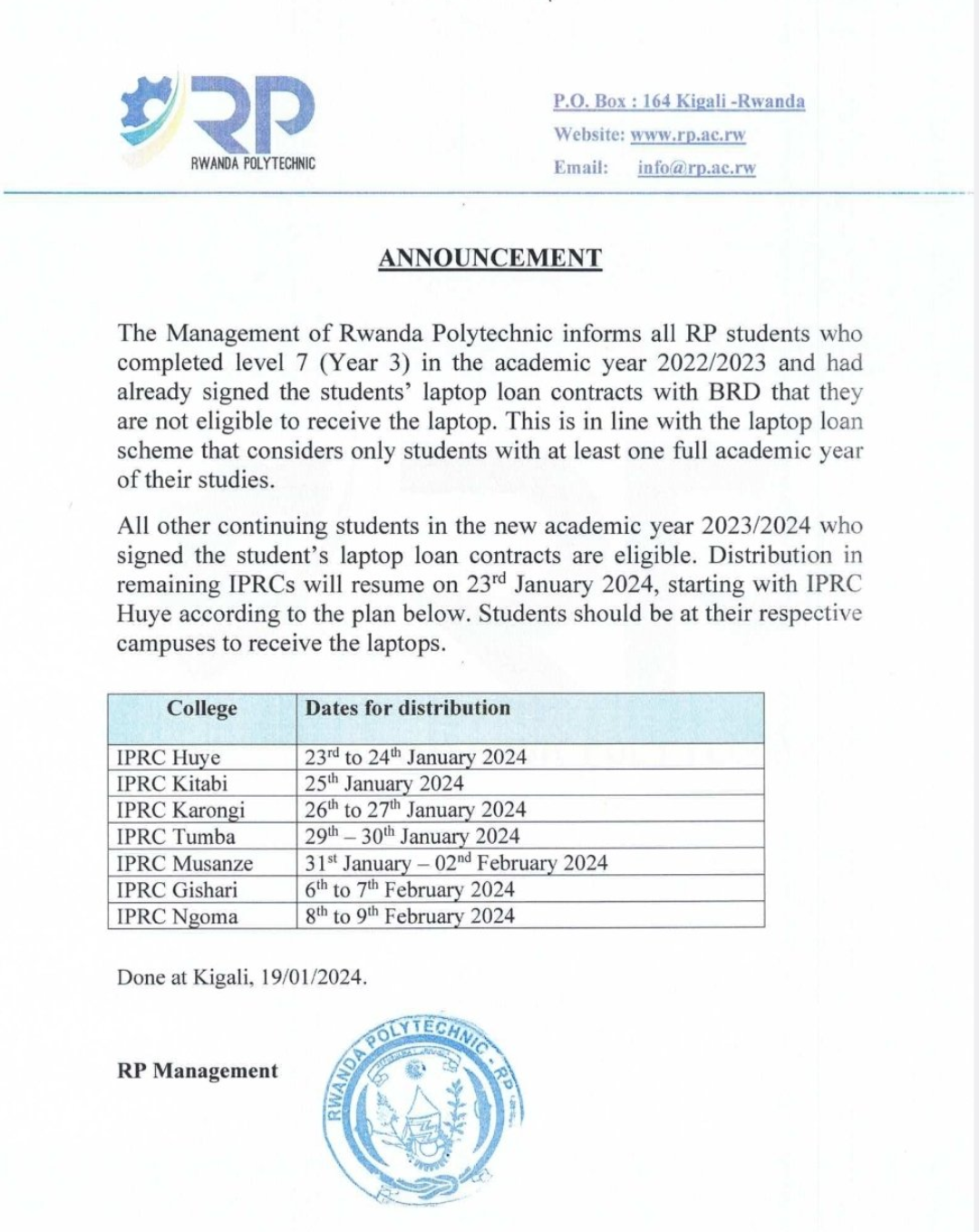 Abanyeshuri biga muri Kaminuza z’imyuga n’ubumenyingiro Rwanda Polytechnic (IPRCs) bari bategereje guhabwa mudasobwa ku banyeshuri bo mu myaka isoza bakiriye inkuru itari nziza.