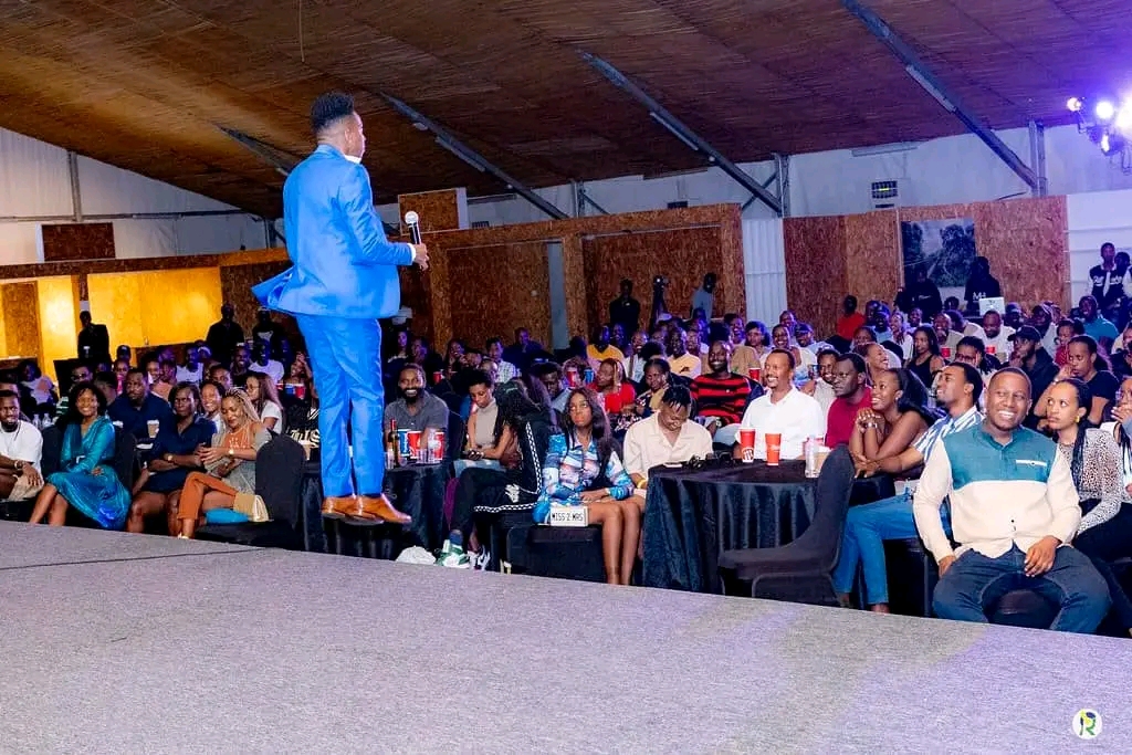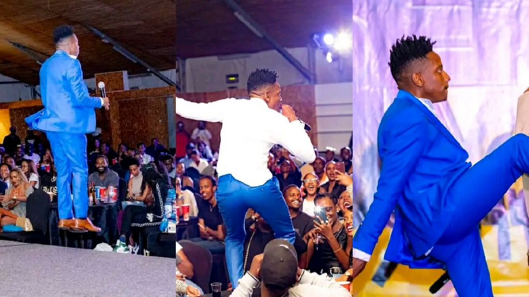 Kubera kutiyizera ku ndeshyo ye, umunyarwenya Eric Omondi yisunze udutebe ubundi aduhagararaho kugira ngo abafana bamubone.
