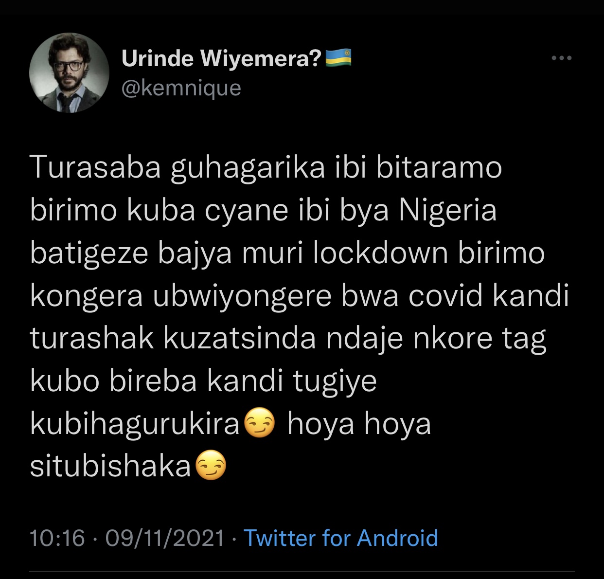 Urinde Wiyemera yagize ati « Turasaba guhagarika ibi bitaramo birimo kuba cyane ibi bya Nigeria batigeze bajya muri lockdown birimo kongera ubwiyongere bwa covid kandi turashak kuzatsinda ndaje nkore tag kubo bireba kandi tugiye kubihagurukira😏 hoya hoya situbishaka😏».