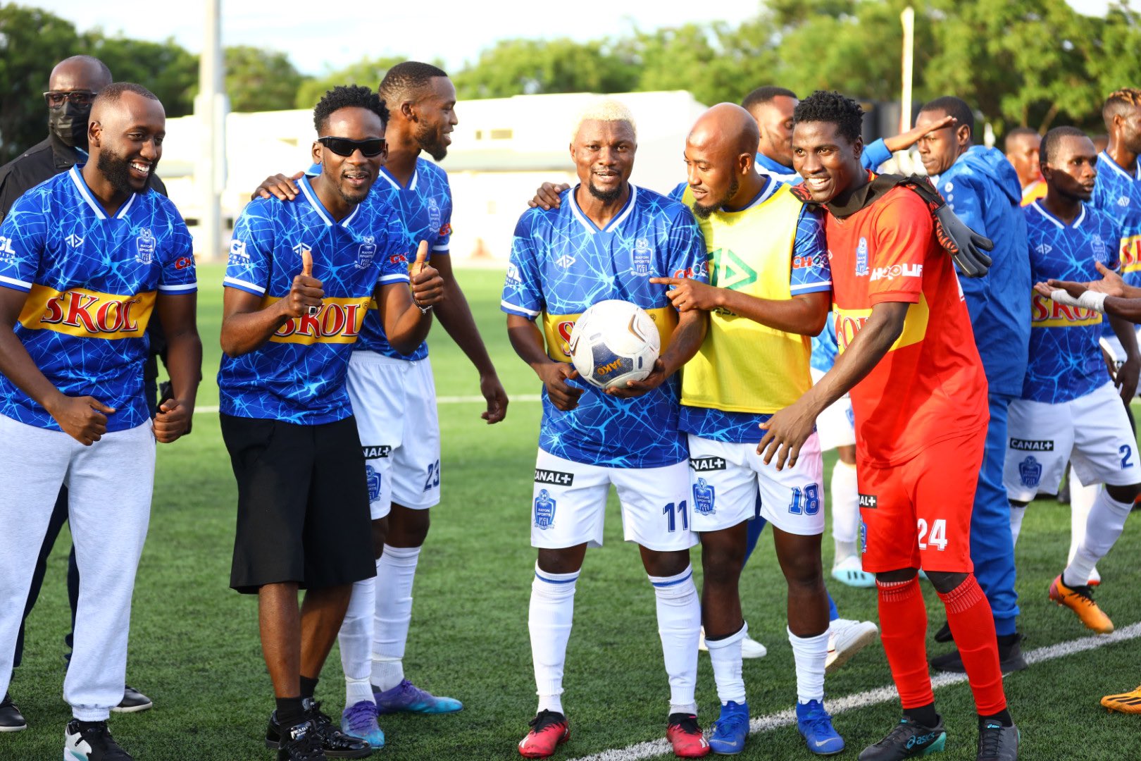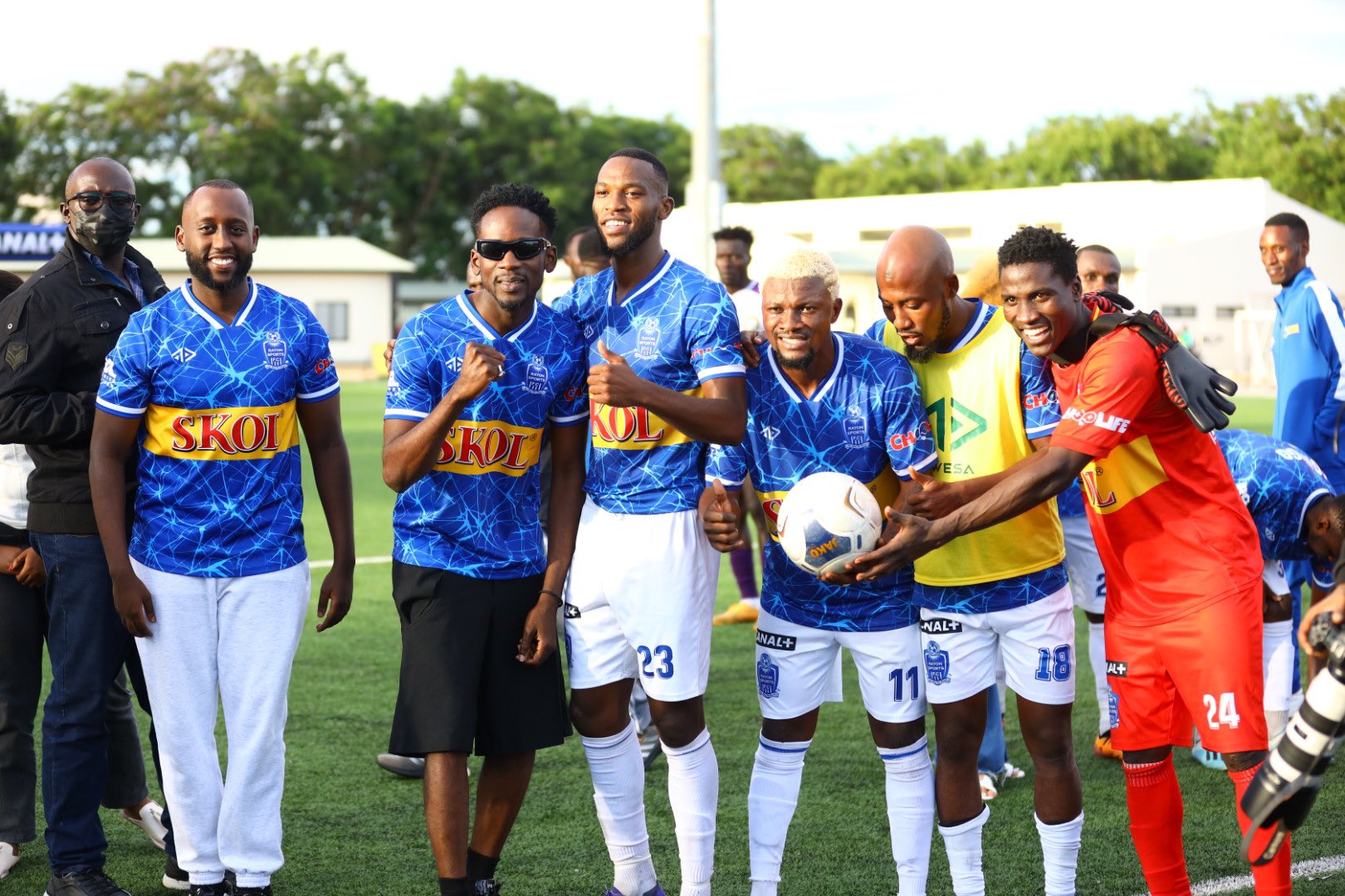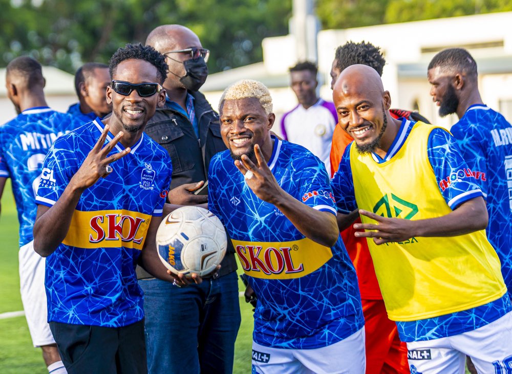 Nyuma y’umukino na Sunrise, Mr Eazi wari waje kwihera ijisho uwo mukino yifotoranyije n’abakinnyi ba Rayon Sports.