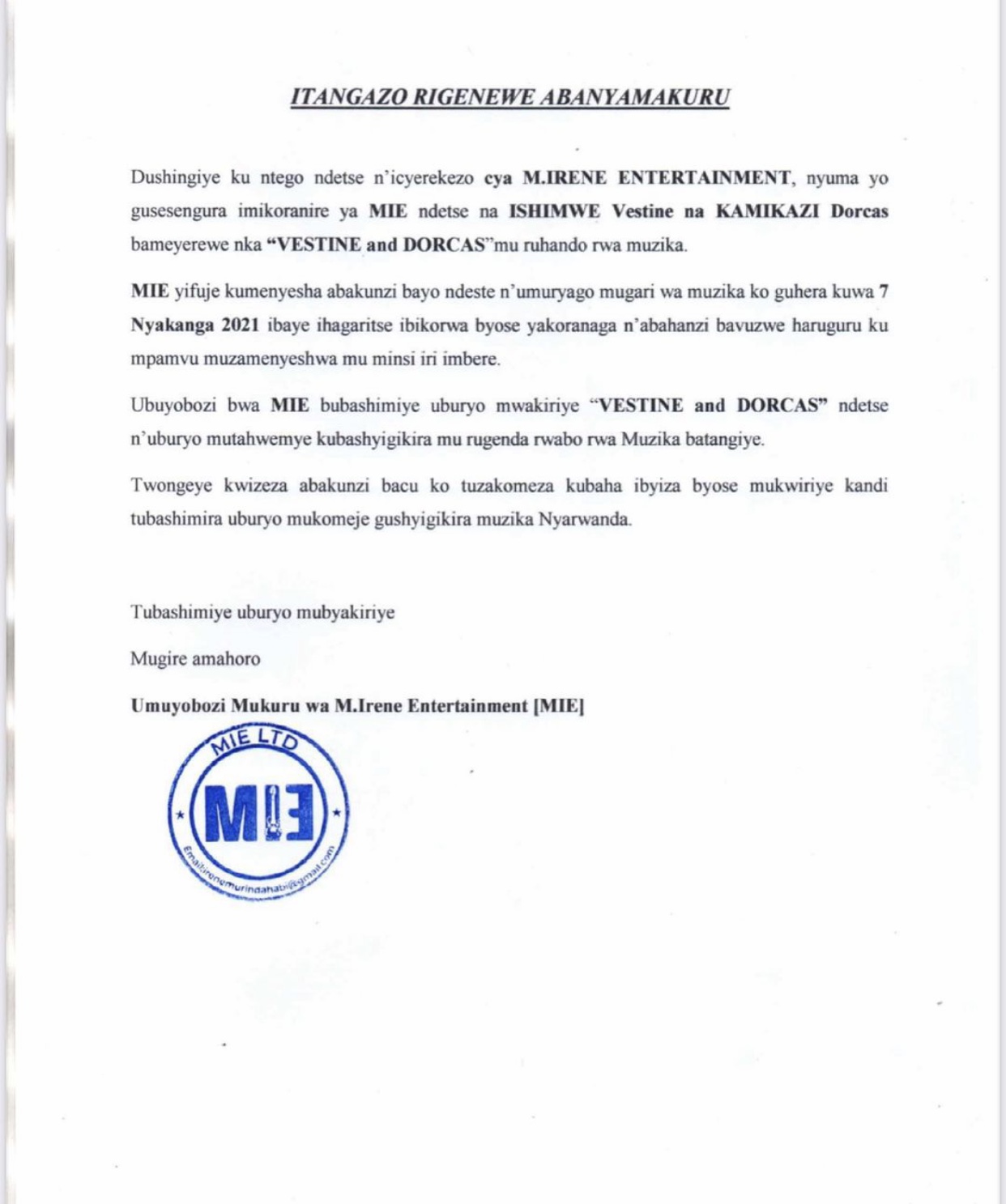 Ahagana ku isaha ya Saa tanu z’amanywa zo ku munsi w’ejo tariki ya 07 Nyakanga nibwo inkuru yabaye kimomo ko Vestine na Dorcas bamaze gutandukana na MIE iyoborwa na Irene Murindahabi nyuma y’itangazo ryari rimaze kujya hanze.