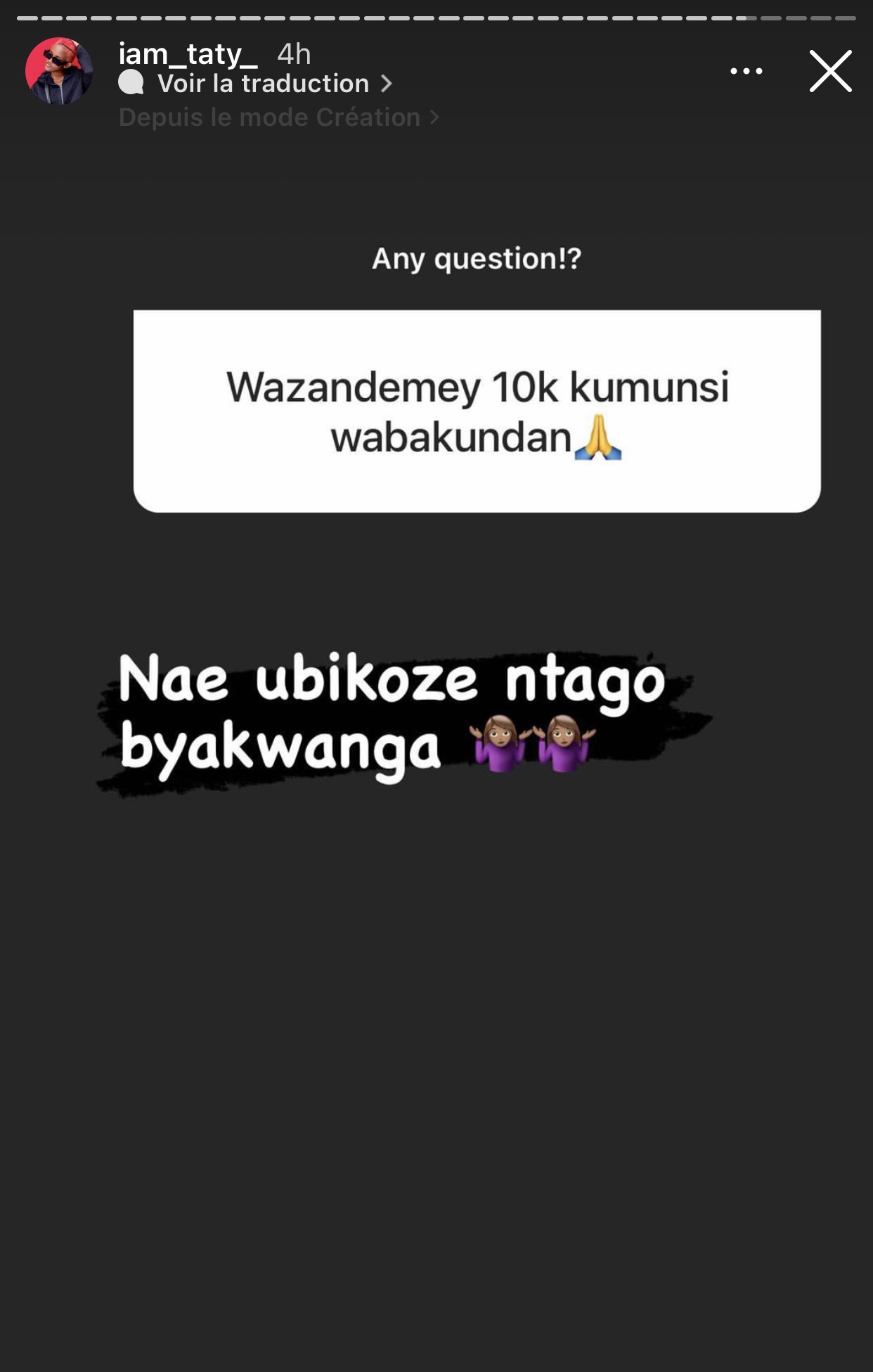 Ibi byabaye nyuma yuko Mama Cyangwe abinyujije kuri story ya instagram ye yari yasabye abafana be ko bamubaza ibibazo bitandukanye maze nawe akabasubiza. Umwe mu bafana be yamubajije ati « Wazandemeye 10k ku munsi w’abakundana🙏🏽». Mama Cyangwe yahise amusubiza agira ati « Nae ubikoze ntago byakwanga🤷🏽‍♀️🤷🏽‍♀️».