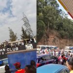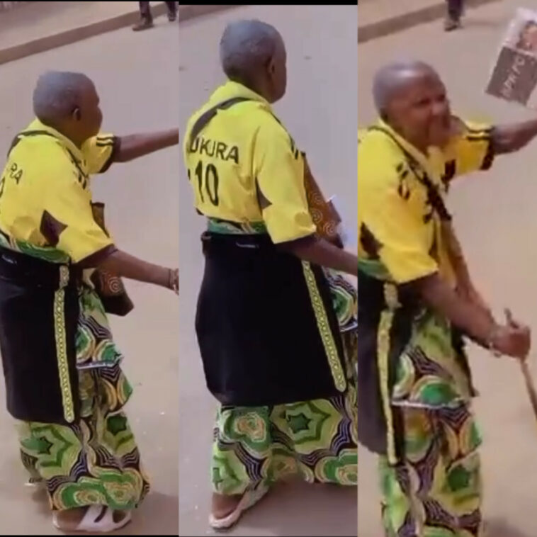 Uyu mukecuru uyumunsi yambaye imyenda ya Mukura afata n’idarapo rya Apr Fc ubundi yerekeza ku kibuga  I Huye ahagiye kubera umukino ukomeye ugiye guhuza Apr Fc na Rayon Sport.