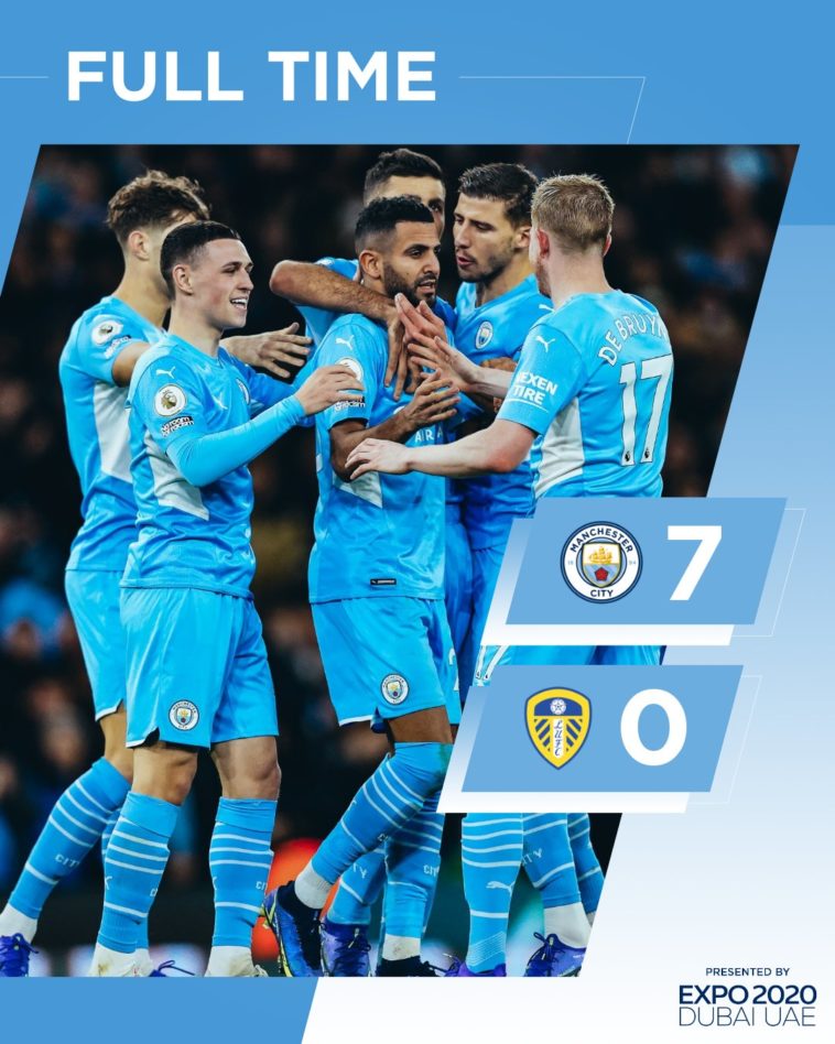 Bidateye kabiri Bernardo Silva yaje guhusha igitego nyuma yaho nta muzamu wari mw’izamu, maze ikipe ya Leeds ikomeza kugorwa kuko yageze ku munota wa 13 Ari ibitego 2-0, mu gihe Jack Grealish yaje gutsinda igitego cye cya mbere mu mateka ye kuva yatangira gukina umupira wa maguru atsindishije umutwe, ku mupira mwiza wari uhinduwe na Mahrez maze atsinda icyi gitego neza mu mateka ye kiba igitego cya mbere atsindishije umutwe muri Premier League.
