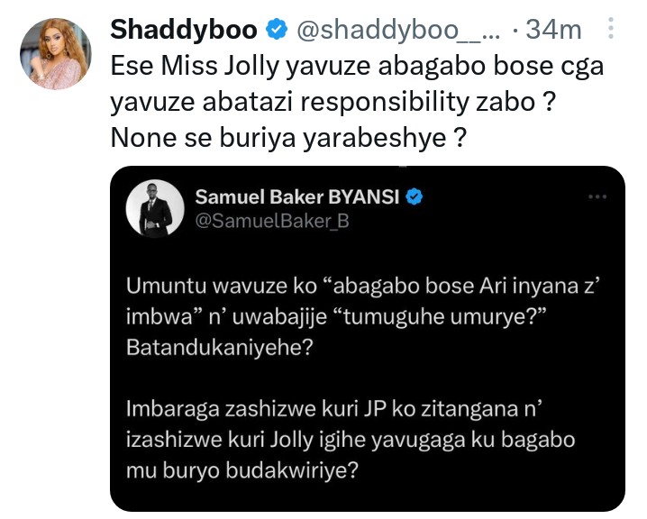 Shaddy Boo yahise amusubiza ati “Ese Miss Jolly yavuze abagabo bose cyangwa yavuze abatazi inshingano zabo? None se buriya yarabeshye?”