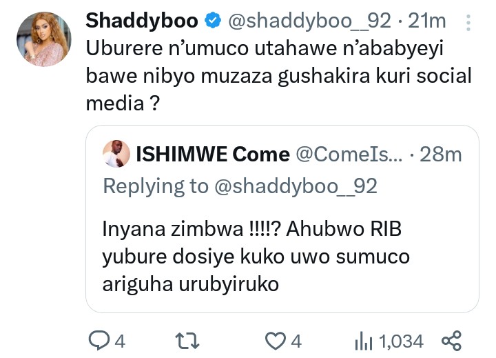 Uyu nawe Shaddy Boo yamusubije agira ati “Uburere n’umuco utahawe n’ababyeyi bawe nibyo muzaza gushakira kuri social media?”