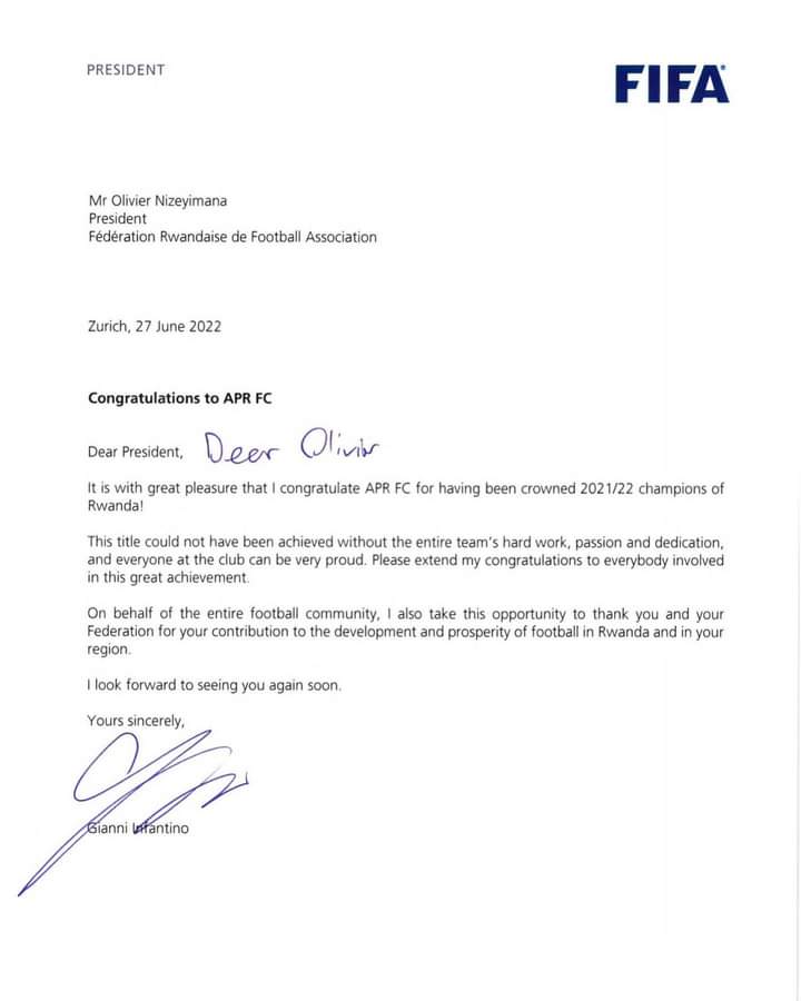 Muri iyi baruwa, Perezida wa FIFA yashimiye abigize uruhare kugira ngo Apr Fc yegukane igikombe maza aboneraho n’umwanya wo gushima uruhare rwa Apr Fc mu iterambere ry’umupira w’amaguru mu Rwanda.
